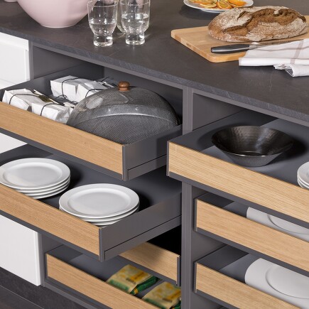 Eine besondere Lösung zeigt das Bild: eine Art Kreuzung aus Schubladenunterschrank und Regal. Auf den Auszügen lässt sich einiges stapeln. Dabei sind Front, Seitenteile und Rückwand der Auszüge aber nur halb so hoch wie die verfügbare Höhe. So haben Sie wunderbar Einblick und im Nu Zugriff auf alles, was Sie hier verstauen.